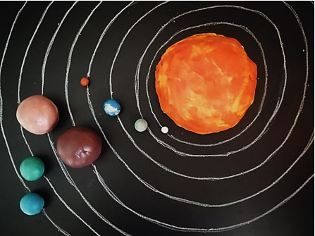 Рассматриваем схему. Находим Солнце и планеты. Мысленно достраиваем схему так, чтобы представить себе Солнце полностью, а планеты обращающимися вокруг него. Учитываем, что планеты движутся по немного вытянутым орбитам.