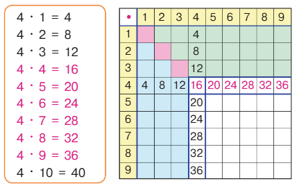 1. Прочитай таблицу умножения на 4. Какие ещё равенства можно составить для каждого случая? Почему новыми являются только случаи, выделенные красным цветом?