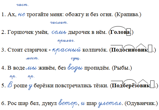 Прочитайте. Догадайтесь, какие слова в загадках пропущены. Впишите их. Укажите, какой частью речи является каждое из этих слов. Разберите выделенные слова по составу.