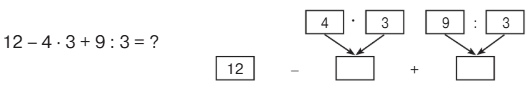 | 1) 4 • 3 = 12 | 2) 9 : 3 = 3 | 3) 12 - 12 = 0 | 4) 0 + 3 = 3 |