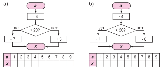 а) Сначала умножаем на 4 вводимое число, затем проверяем больше ли 20 результат. Если ответ отрицательный, прибавляем к числу 5. Если ответ положительный, вычитаем из числа 7. Ответ записываем в таблицу.