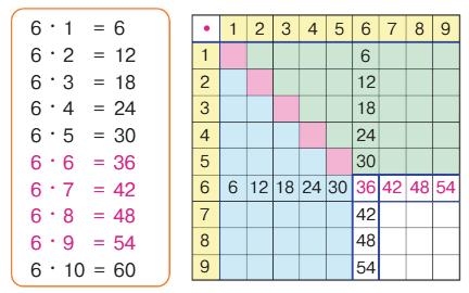 1. Прочитай таблицу умножения на 6. Какие ещё равенства можно составить для каждого случая?Почему новыми являются только случаи, выделенные красным цветом?