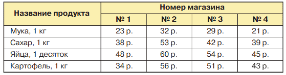 11. В таблице приведены цены в рублях на муку, сахар, яйцу и капусту в четырёх продуктовых магазинах.