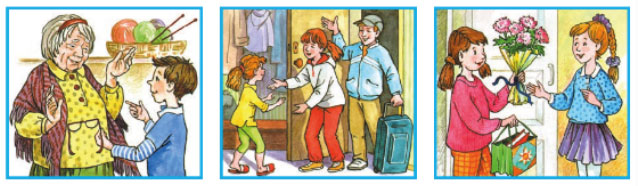 Рассмотрите рисунки. Придумайте диалоги между героями, используя слова: здравствуйте, спасибо, до свидания, извините, пожалуйста, благодарю.