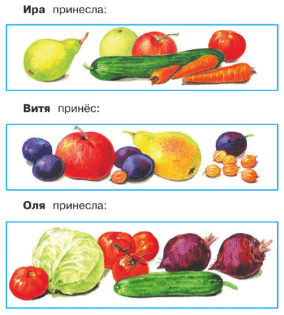 Из овощей Ира правильно принесла огурец, помидор, морковь. Но она принесла ещё и фрукты – яблоко и груши. Это неправильно.