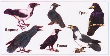 2. Сравни ворону, галку и грача на цветных рисунках. Чем они похожи? А чем различаются?