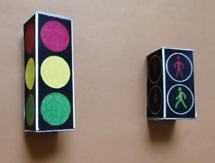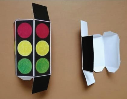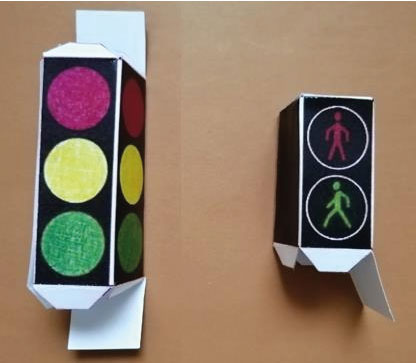 3. Вырежи из Приложения заготовки и склей из них модели светофора. Дома с их помощью научи свои игрушки переходить дорогу. Покажи взрослым, чему научились твои игрушки.