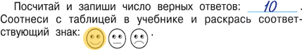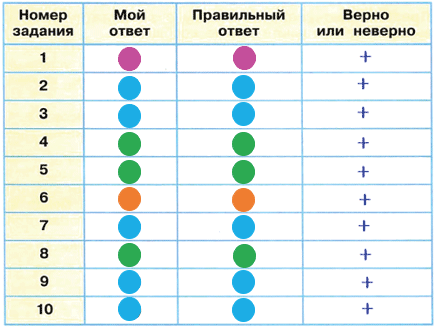 Выполняем задания учебника, заполняем таблицу. В столбце "Мой ответ" закрашиваем кружок в тот цвет, который, на наш взгляд, соответствует правильному ответу. В столбце "Правильный ответ" закрашиваем кружки так, как показано на "Страничках для самопроверки". Сравниваем эти два столбца и заполняем третий: если наш ответ правильный, ставим знак "+", если неправильный – знак "–".