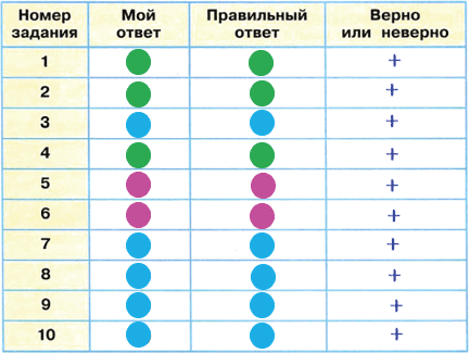 Выполняя задания учебника, заполняем таблицу. В столбце "Мой ответ" закрашиваем кружок в тот цвет, который, на наш взгляд, соответствует правильному ответу. В столбце "Правильный ответ" закрашиваем кружки так, как показано на "Страничках для самопроверки". Сравниваем эти два столбца и заполняем третий: если наш ответ правильный, ставим знак "+", если неправильный – знак "–".