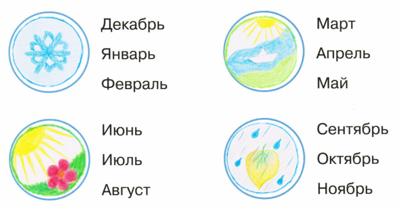 3. К каким временам года относятся эти месяцы? Придумайте значок для каждого времени года. Нарисуйте его в кружках рядом с названиями месяцев.