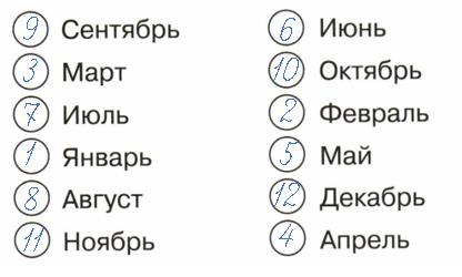 4. С помощью рисунка-схемы в учебнике или самостоятельно пронумеруй названия месяцев в правильной последовательности. Начни с января. Попроси соседа по парте проверить твою работу.