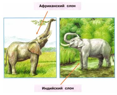 1. Определи, какой из этих слонов африканский, а какой – индийский. Укажи стрелками. Объясни, по какому признаку тебе удалось их различить.