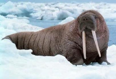 Удивительные жители Северного Ледовитого океана – моржи.  Они самые крупные представители ластоногих в мире. Длина их тела достигает до трёх с половиной метра, а вес до двух тонн. У моржей самые огромные, длинные бивни.