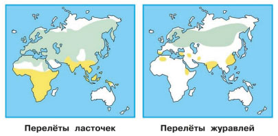 2. На этих схемах зелёным цветом показаны районы, где ласточки и журавли проводят лето. Жёлтым цветом показаны районы, где они зимуют. Обозначьте синими стрелками направление осенних перелётов ласточек и журавлей. Красными стрелками обозначьте направление из весенних перелётов.