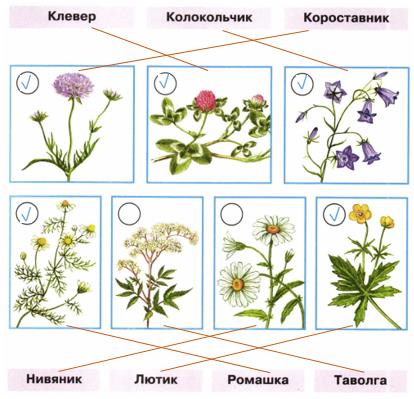 1. Как называются эти цветы? Соедините линиями названия и рисунки. Если не знаете, воспользуйтесь атласом – определителем.