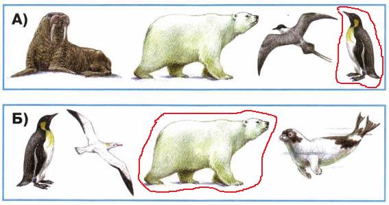 1. А) Лишний пингвин, так как он живёт в Антарктиде, а остальные животные во льдах Северного Ледовитого океана.