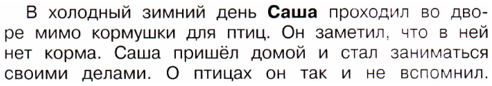 В холодный зимний день Саша проходил во дворе мимо кормушки птиц. Он заметил, что в ней нет корма. Саша пришёл домой и стал заниматься своими делами. О птицах он так и не вспомнил.
