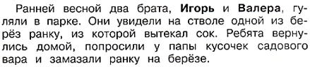 Ранней весной два брата, Игорь и Валера, гуляли в парке. Они увидели на стволе одной из берёз ранку, из которой вытекал сок. Ребята вернулись домой, попросили у папы кусочек садового вара и замазали ранку на берёзе.