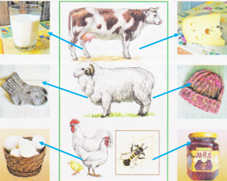 2. Рассмотрите рисунки и фотографии. Что человек получает от домашних животных? Покажите это с помощью стрелок из цветной бумаги. Придумайте название полученной модели.
