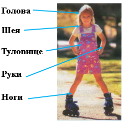 1. Рассмотрите на фотографиях внешнее строение человека. Покажите у ребят части тела: голову, шею, туловище, верхние конечности (руки), нижние конечности (ноги). Покажите на своём теле эти части, а так же грудь, живот и спину.