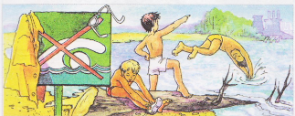 Нельзя купаться в местах, где купание запрещено. В таких местах на дне реки или пруда находятся камни, сломанные старые деревья – коряги, которыми можно серьёзно пораниться. Также купание запрещено в местах, где в реку сливаются отходы заводов и фабрик.