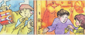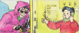 А здесь вор пытается открыть своими ключами дверь. Срочно нужно звонить родителям или по номеру 102 или 112.