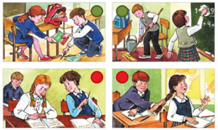 Красными фишками я накрыла картинку, на которой мальчик списывает, и картинку, на которой мальчик дергает девочку за косу. Это плохие поступки.