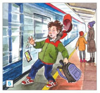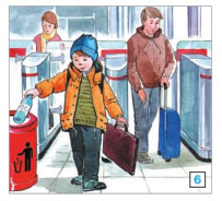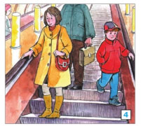На этих рисунках проиллюстрированы следующие правила безопасности: в автобусе держитесь за поручни, не бегайте по эскалатору и не сидите на нём, не заходите за жёлтую черту на платформе, особенно, если видите электричку.
