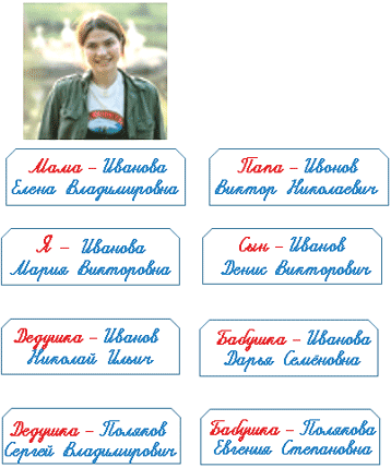 Рассмотрите рисунок. Сколько поколений семьи Серёжи и Нади на нём показано? Назовите представителей каждого поколения.