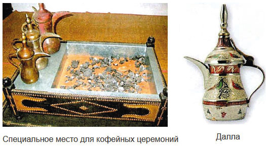 Кофе разливают из традиционных арабских кофейников с длинным носиком, которые называются "далла". Готовят кофе в специальном месте для кофейных церемоний.