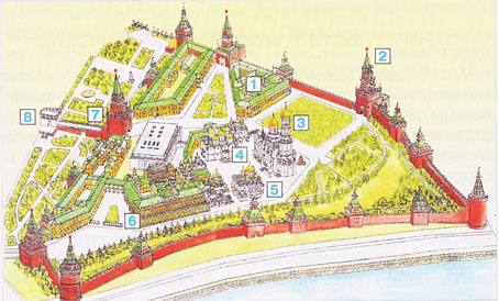 1. Представляем, что пролетаем над Московским Кремлём на вертолёте. Рассматриваем рисунок. Находим на нём достопримечательности Кремля и рассказываем о них.