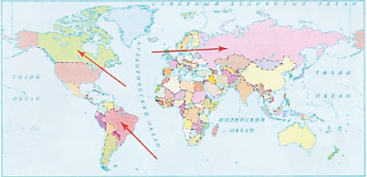 10. Ребята получили задание показать на политической карте мира Россию, Канаду и Бразилию.