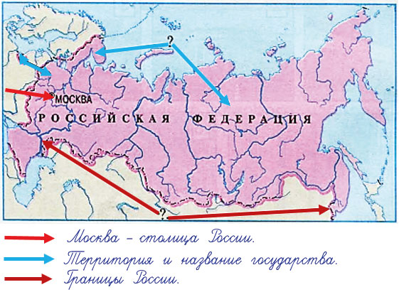 5. Перечисли, что имеет любое государство. Какие из этих признаков указаны зелёными стрелками на карте нашей страны?