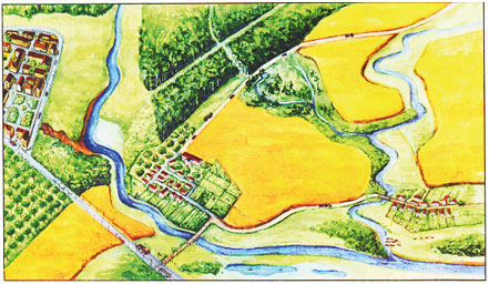 1. Рассмотрите иллюстрации. Сравните рисунок и план местности. Чем план отличается от рисунка?