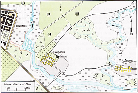 2. При помощи условных обозначений мы видим, что с северо – западной стороны карты находится город Климов. Вокруг Климова пролегает шоссе и телеграфная линия, которые продолжаются вдоль реки Быстрой.