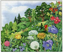 Растения очень разнообразны. Маленькая травинка или могучий дуб, лёгкий одуванчик или тяжёлые ветви с ягодами рябины, хвоинка ели или мягкий лист мать-и-мачехи – это чудесное великолепие природы. На рисунке лишь часть растений нашей планеты. А уже какая яркая картина получается!