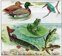 Слева вверху утка – кряква (самка и самец), а справа зимородок. Посередине лягушка прудовая, слева внизу щука, а справа внизу пескарь. Над пескарём тритон обыкновенный.