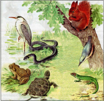 Слева вверху серая цапля, рядом с ней уж обыкновенный. Под цаплей жаба серая, а рядом с жабой черепаха болотная. На дереве белка обыкновенная и поползень. Под деревом ящерица прыткая.