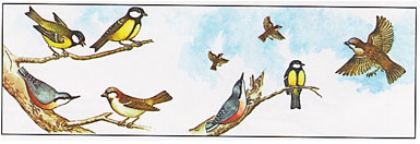 На рисунке мы видим три синицы большой, две – поползня обыкновенного, четыре – воробья домового. Всего девять птиц.