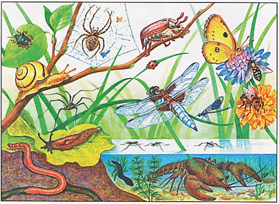 На этом рисунке: дождевой червь, пиявка ложноконская, паук – крестовик, сенокосец, речной рак, майский жук, божья коровка двухточечная, желтушка луговая, шмель, муха – журчалка, стрекоза плоская, красотка блестящая, клопы водомерки, клоп – щитник, слизень бурый, улитка.
