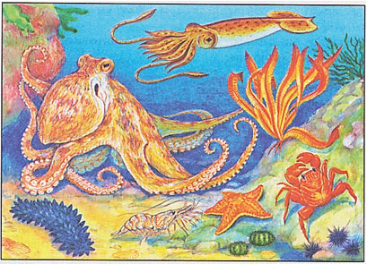 На рисунке изображены: осьминог, морские ежи, краб, морская звезда, креветка, кальмар, морская лилия, морской огурец.