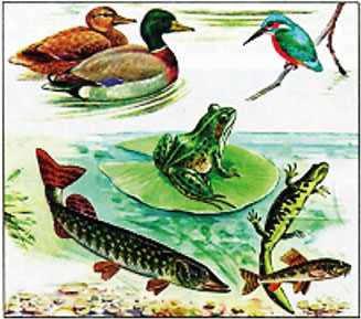 Слева вверху утка – кряква (самка и самец), а справа зимородок. Посередине лягушка прудовая, слева внизу щука, а справа внизу пескарь. Над пескарём тритон обыкновенный.