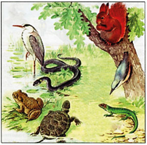 Слева вверху серая цапля, рядом с ней уж обыкновенный. Под цаплей жаба серая, а рядом с жабой черепаха болотная. На дереве белка обыкновенная и поползень. Под деревом ящерица прыткая.