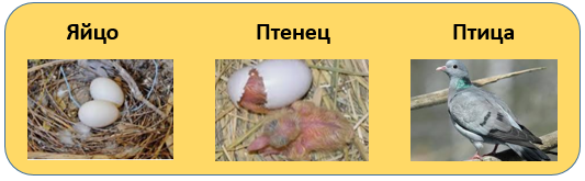 Яйцо – птенец – взрослая птица. Икринка – головастик – взрослая лягушка.