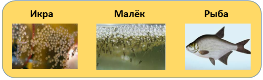 Икринка – малёк – взрослая рыба. Яйцо – личинка – куколка – бабочка.