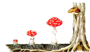 Многие грибы в лесу тесно связаны с деревьями. Нити грибницы срастаются с корнями деревьев и помогают им всасывать из почвы воду и соли. Взамен грибы получают от растений те питательные вещества, которые растения производят на свету. Так грибы и деревья помогают друг другу.