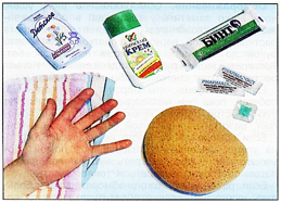 Рассмотри фотографию. Какими средствами ухода за кожей пользуешься ты?