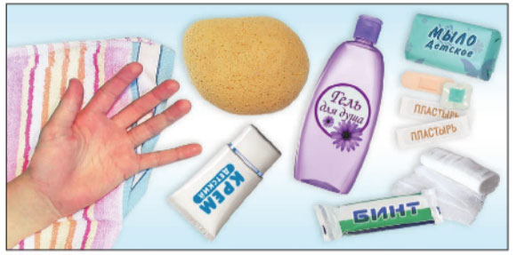 На фото мы видим средства для ухода за кожей: детское мыло, детский крем, полотенце, бинт, медицинский пластырь, пемзу, гель для душа.