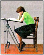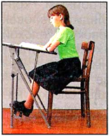 На третьем рисунке девочка тоже сидит неправильно. Она откинулась на спинку стула, спина приняла согнутое положение. Девочка наклонила голову, локти не лежат на столе, ноги не под прямым углом на подставке.