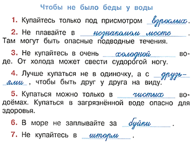 1. Внимательно прочитай памятку, которую пожарный раздал детям. Самостоятельно или с помощью учебника заполни пропуски в тексте.